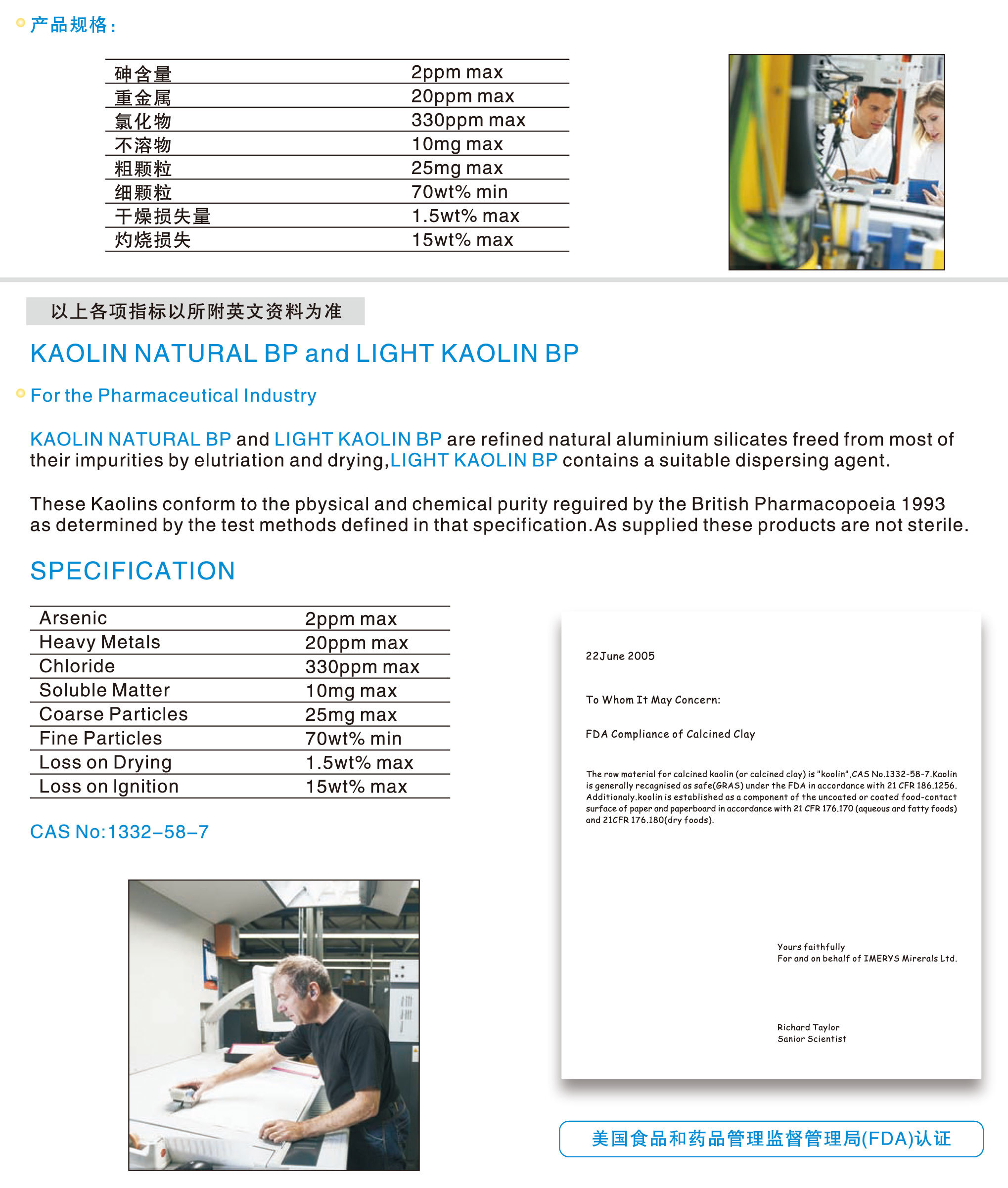 Light Kaolin BP出産(chǎn)于澳大利亞(ya),在淘洗和幹(gan)燥過程中去(qu)除它們的🐆雜(zá)質後,具有很(hěn)純特性和适(shi)當的分散性(xing),産品産地賦(fu)予極其微🚶♀️的(de)鉛🐅、汞、砷含量(liàng)。 Light Kaolin BP符合人體健(jian)康要求,嚴格(gé)按照英國藥(yao)典1993法定測試(shì)🎯規格執行。